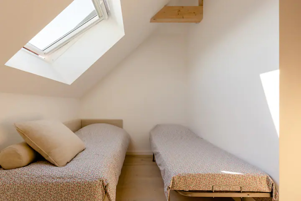 The Duplex (8 sleeps) is composed of 2 double bedrooms (each with double bed, extra bed and baby bed), a mezzanine including a pull-out sofa bed (2 sleeps in 90×190) and a desk, 2 bathrooms (shower and bathtub), 2 separate toilets, a living room, a kitchen–dining room and a large terrace ideal for dining outdoors and enjoying the sunset.