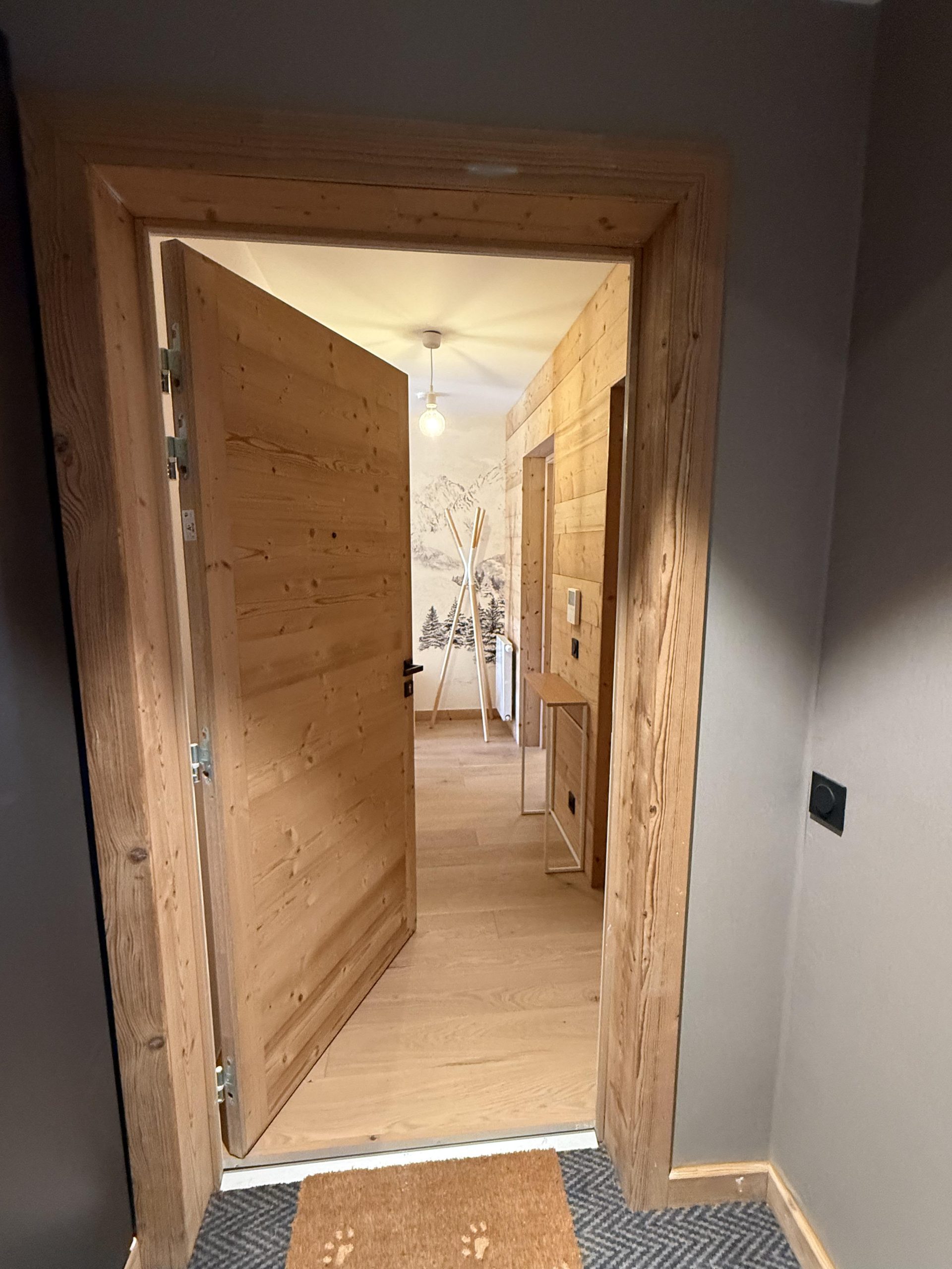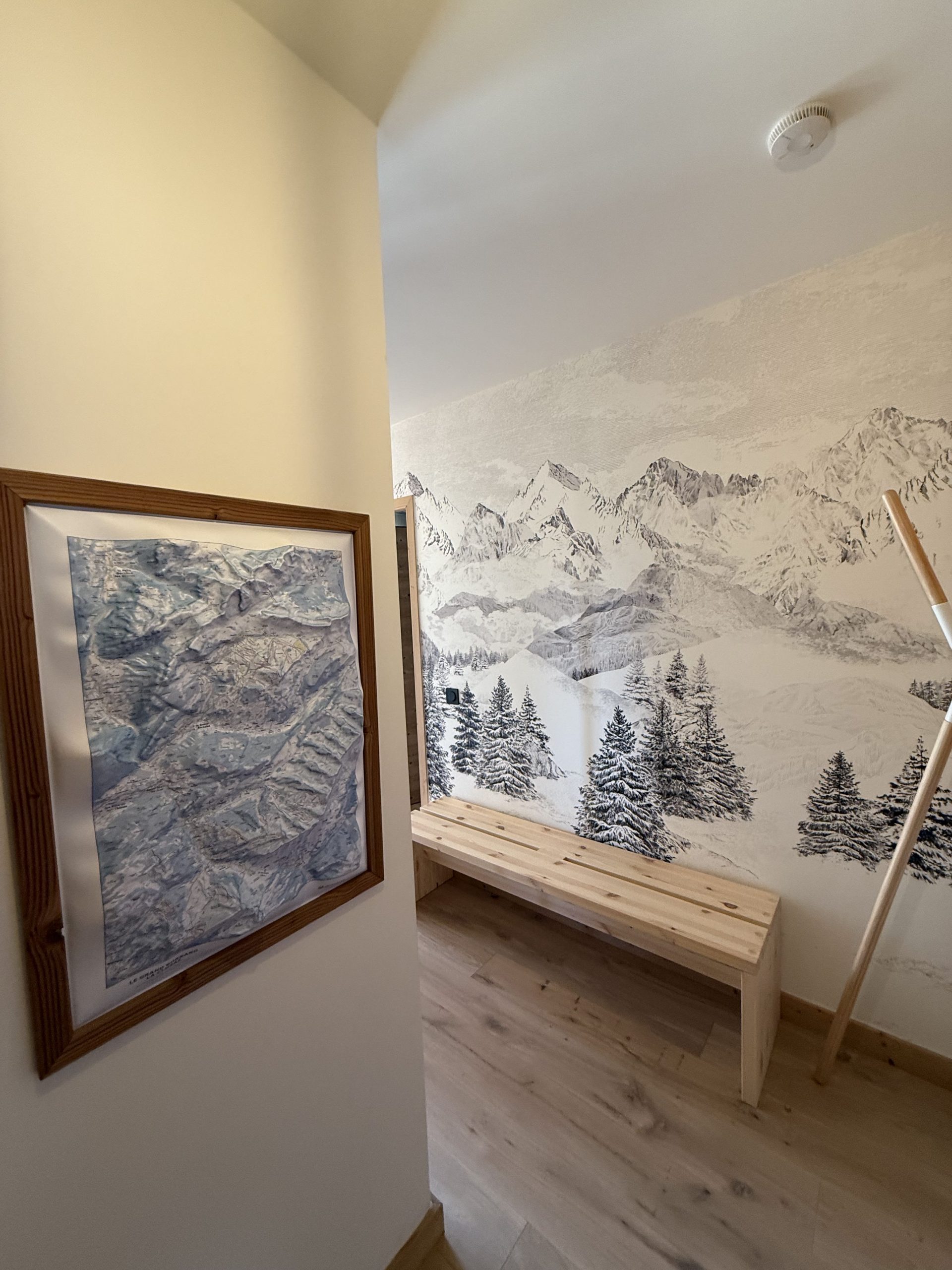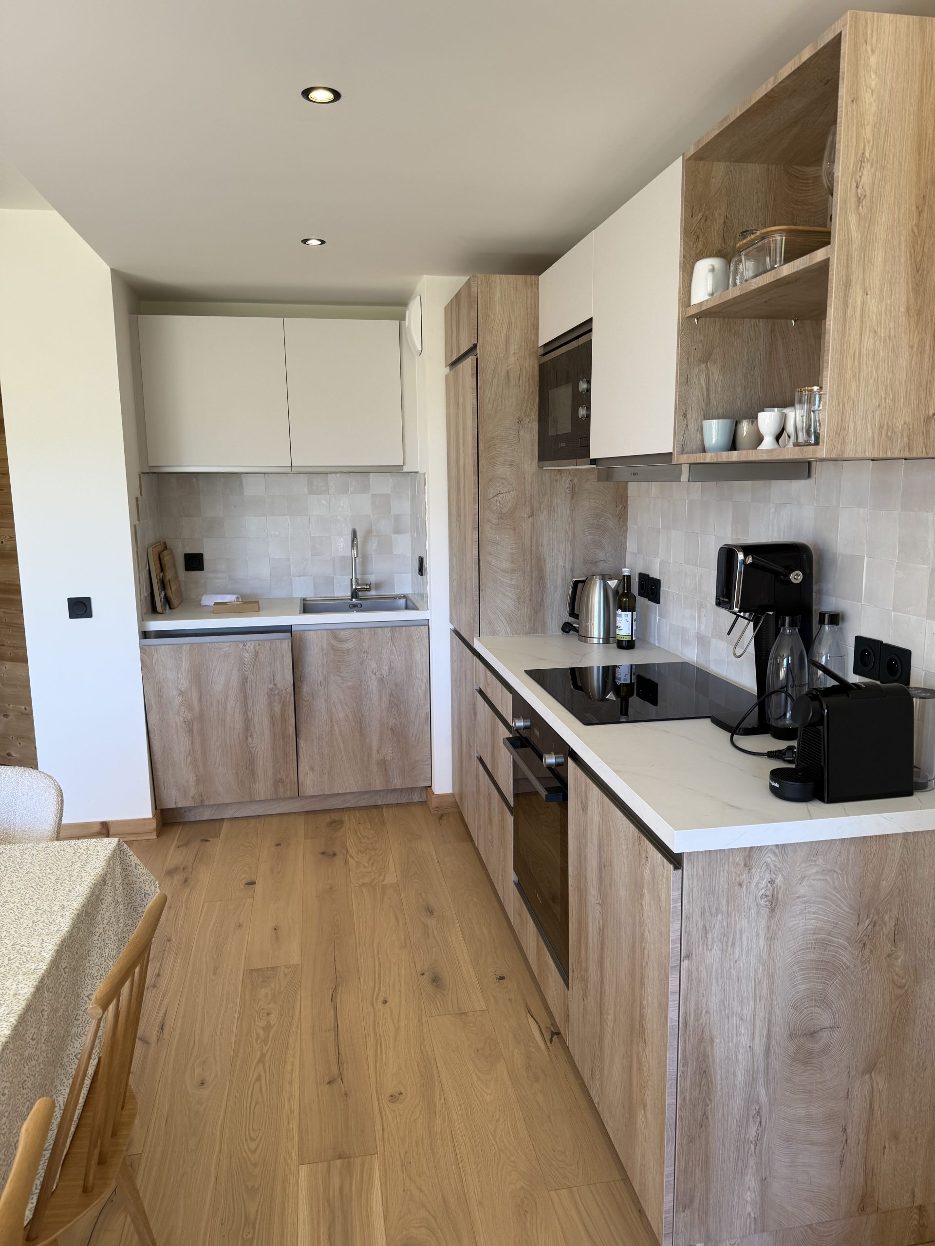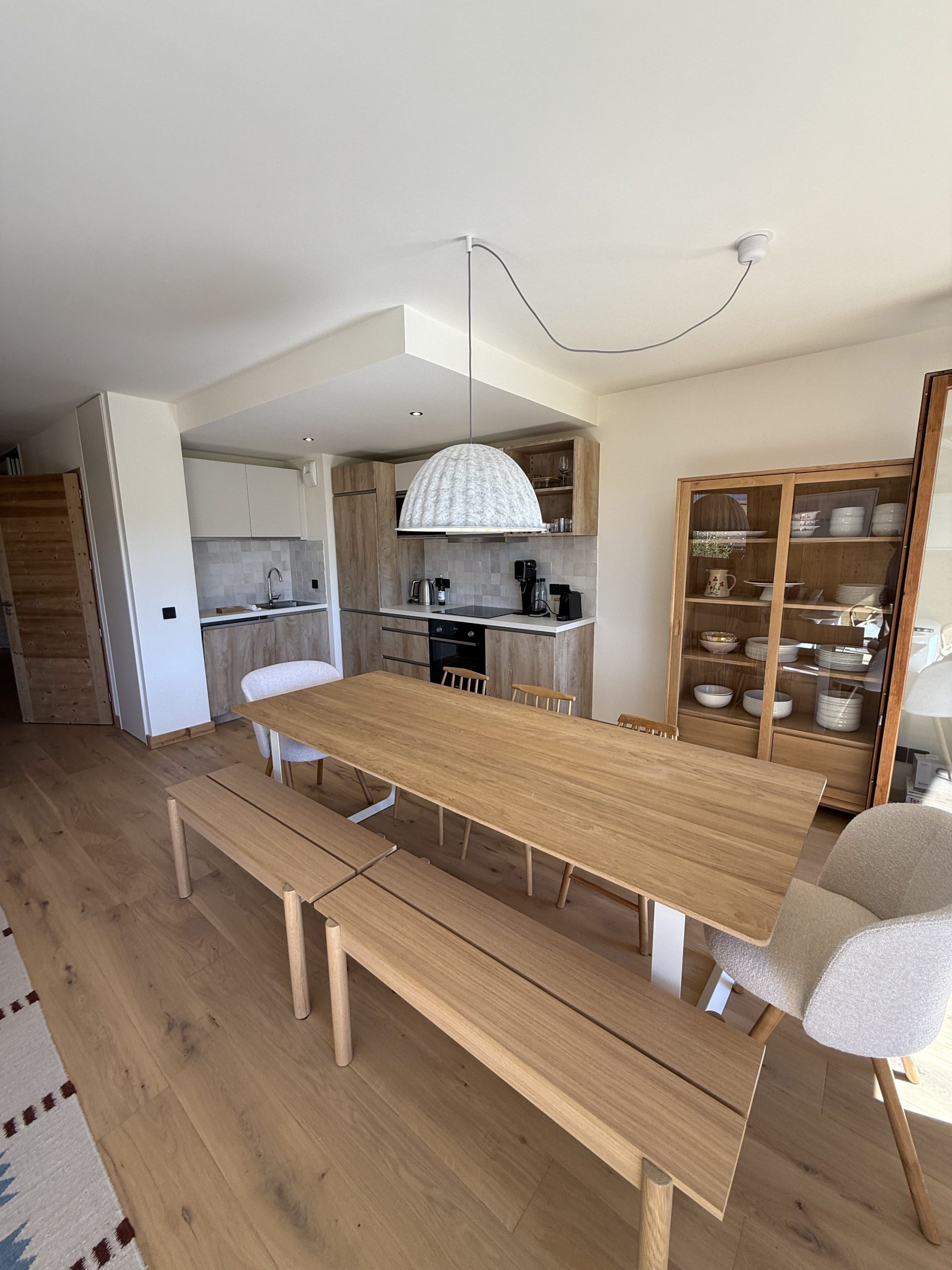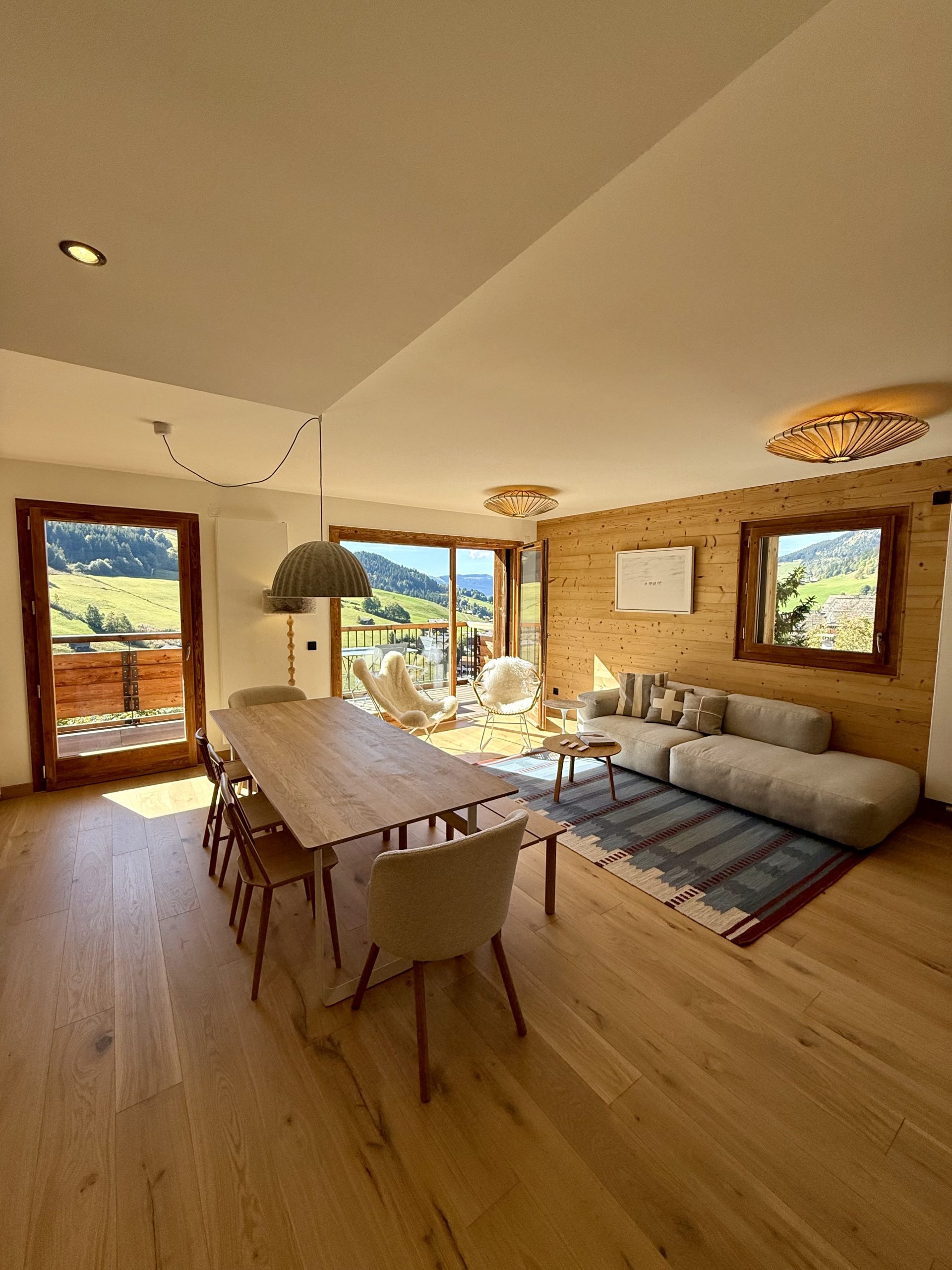 Un intérieur lumineux où l’ambiance alpine rencontre une esthétique moderne et chaleureuse. Orientation Sud et Ouest, avec une vue dégagée sur les pistes et les Aravis.