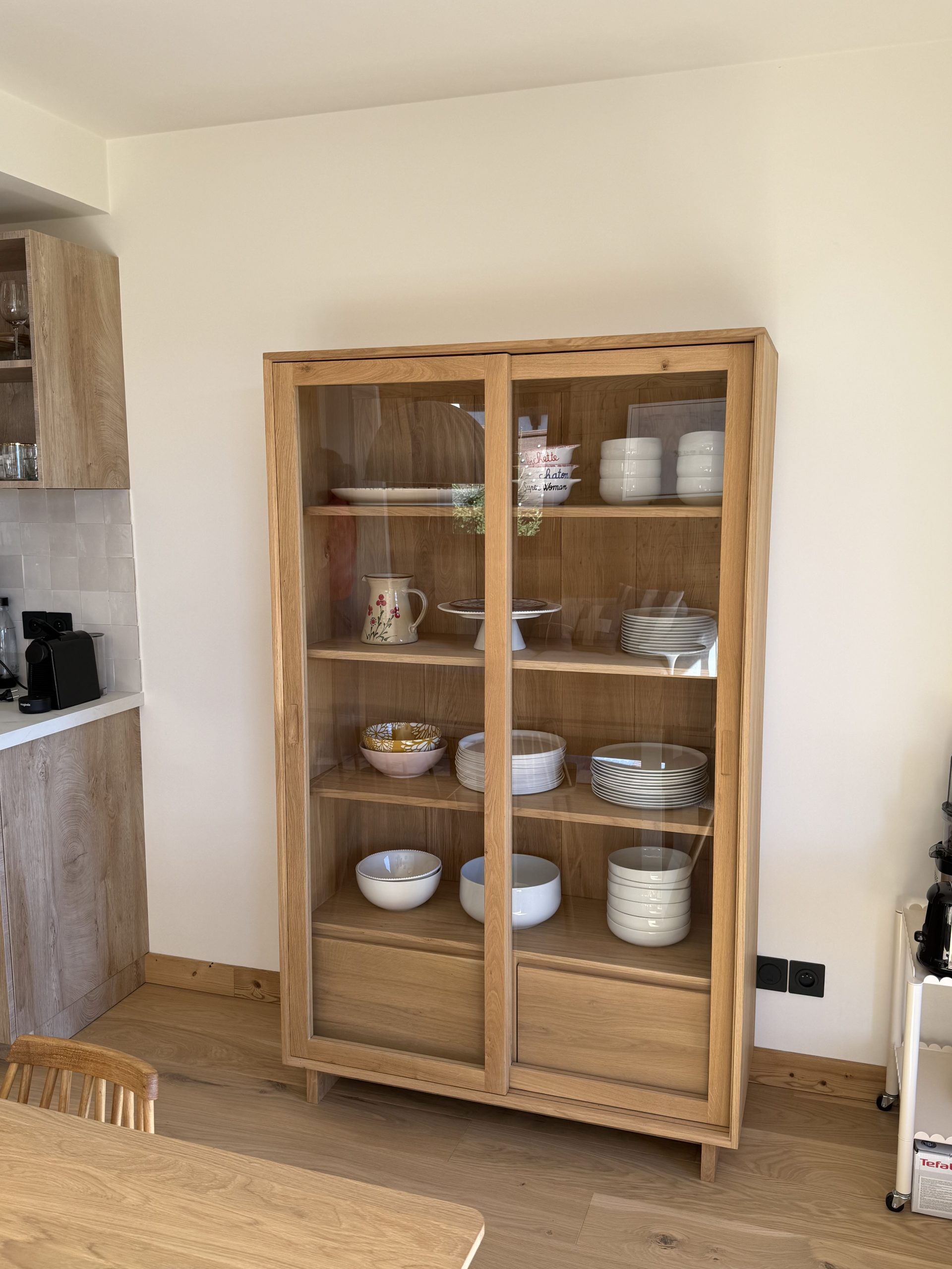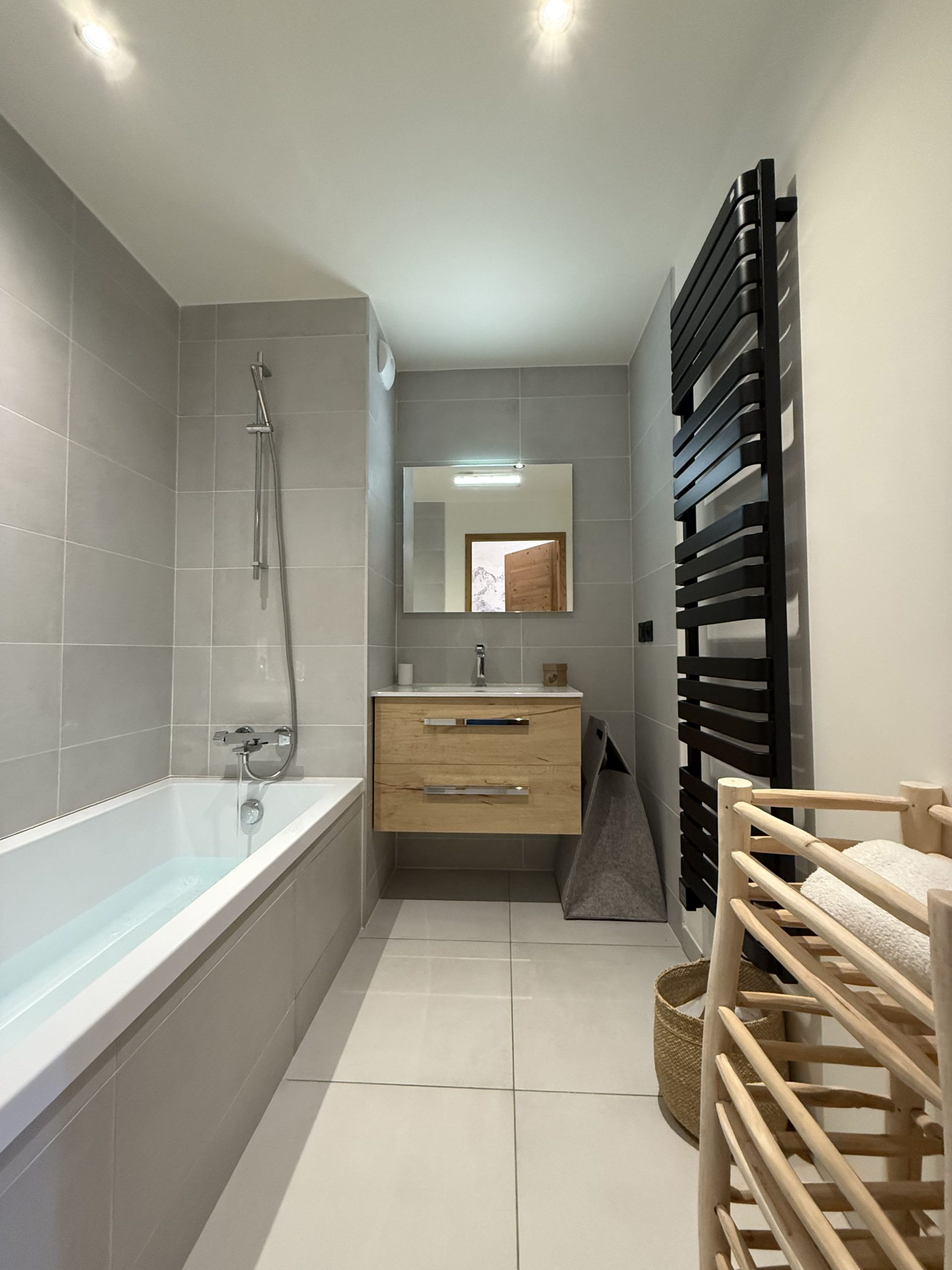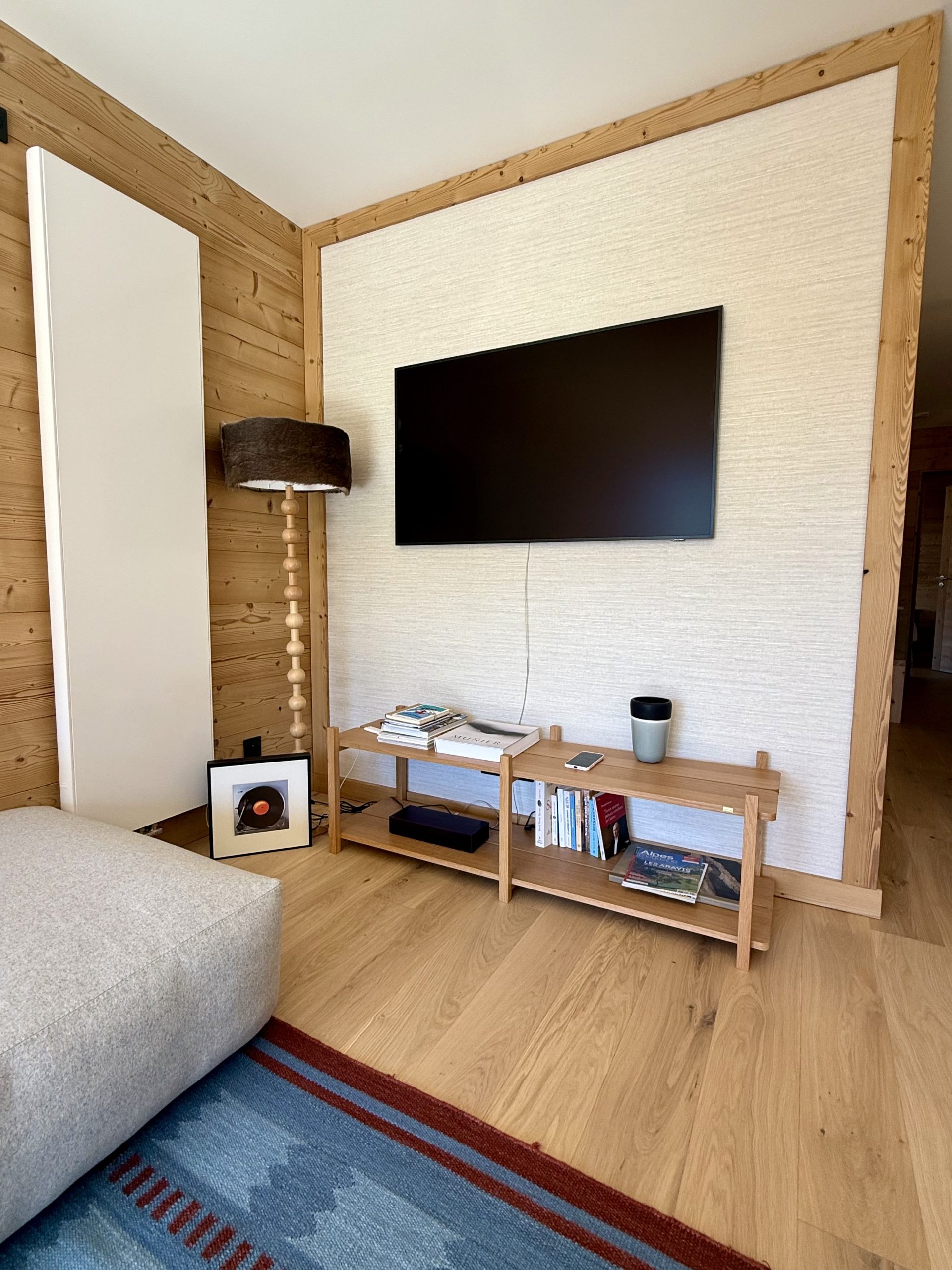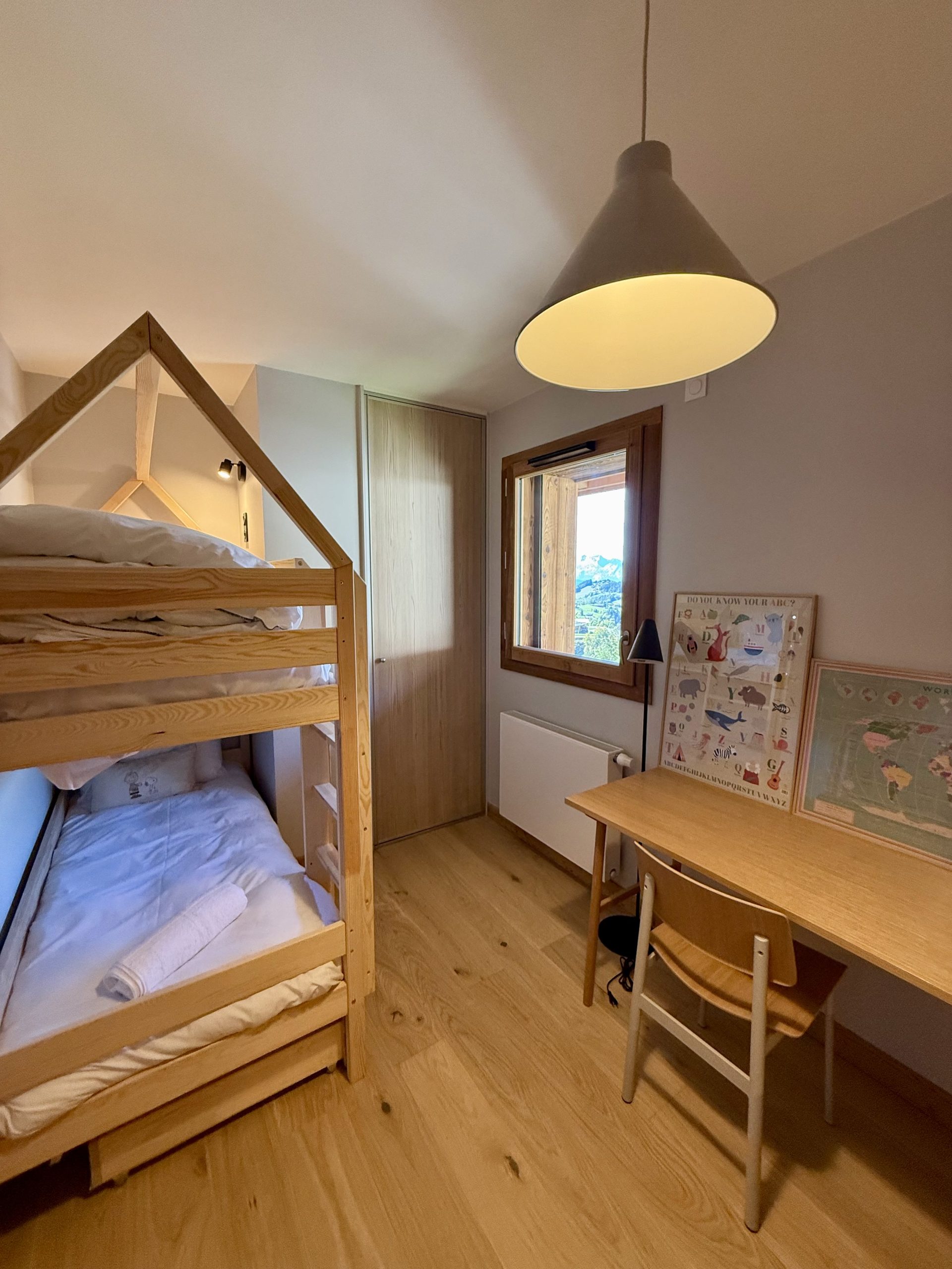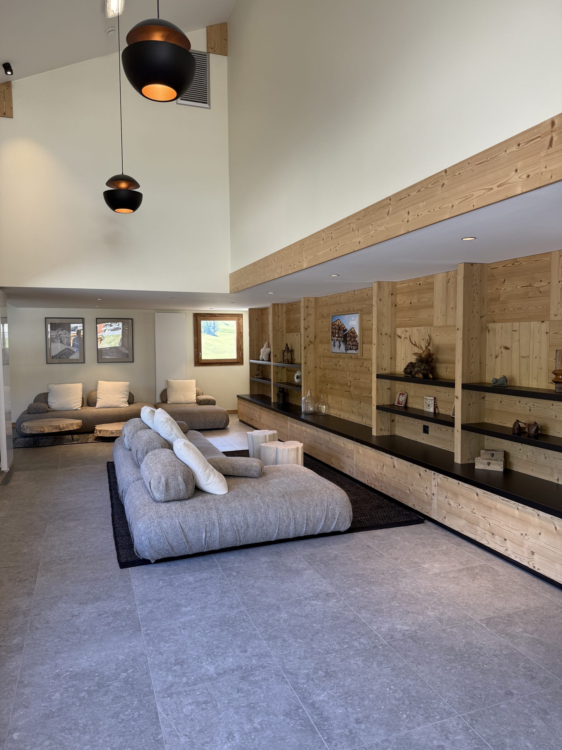 Un intérieur lumineux où l’ambiance alpine rencontre une esthétique moderne et chaleureuse. Orientation Sud et Ouest, avec une vue dégagée sur les pistes et les Aravis.