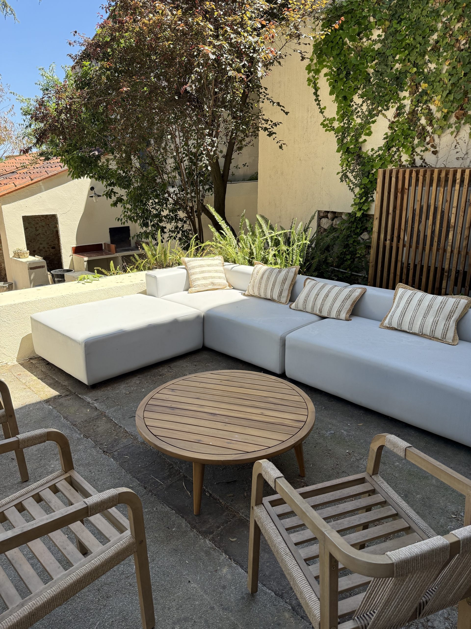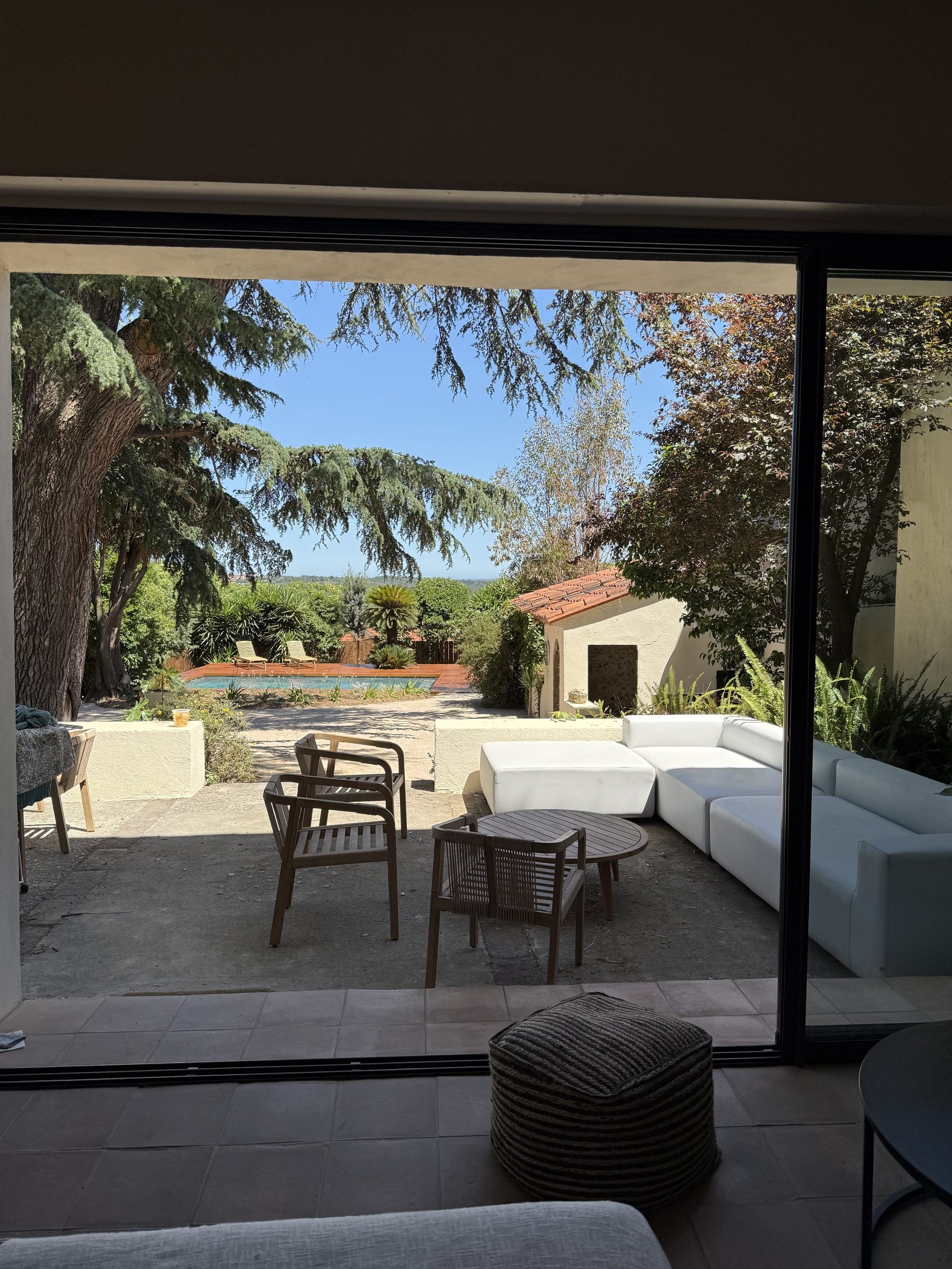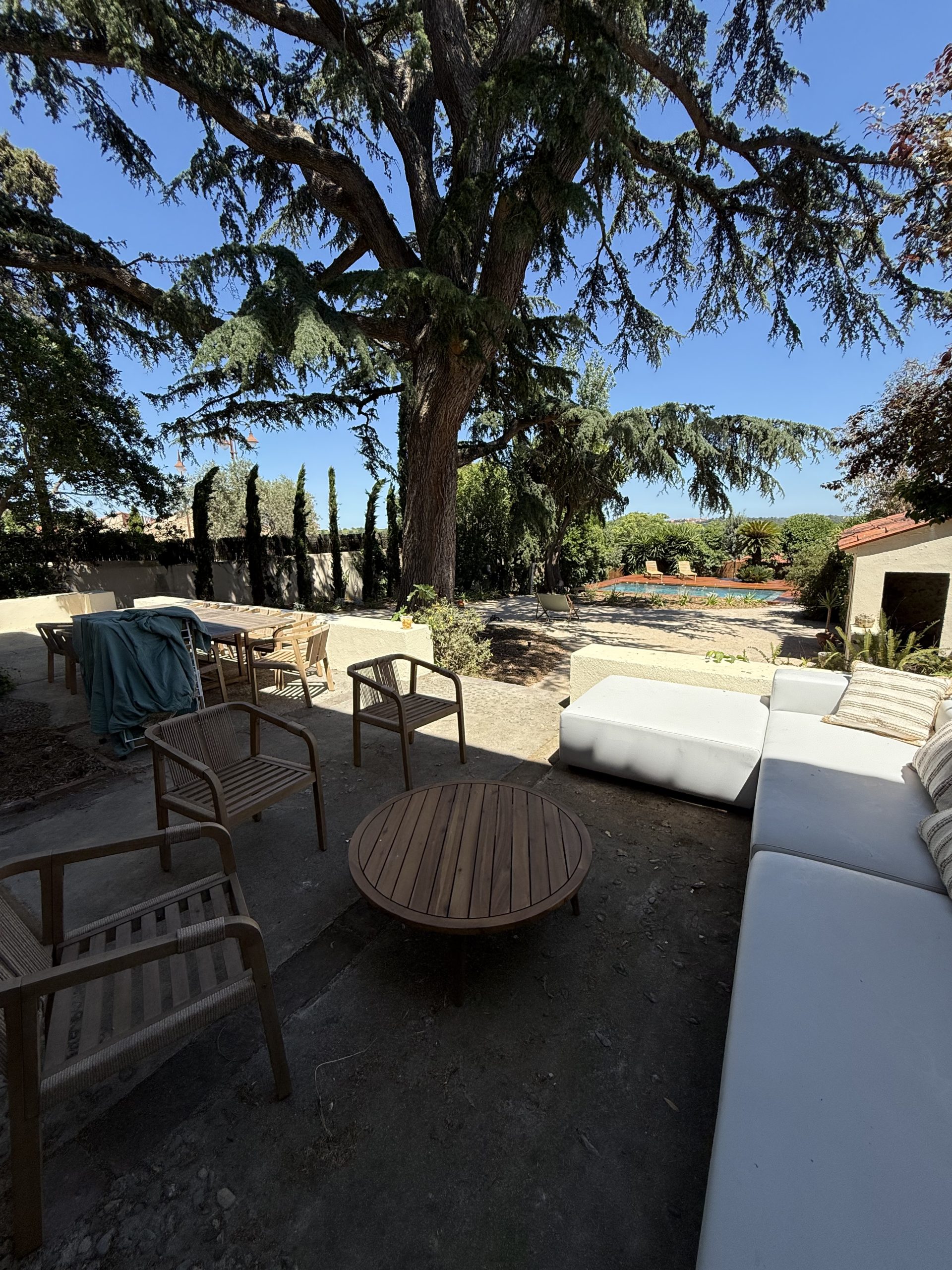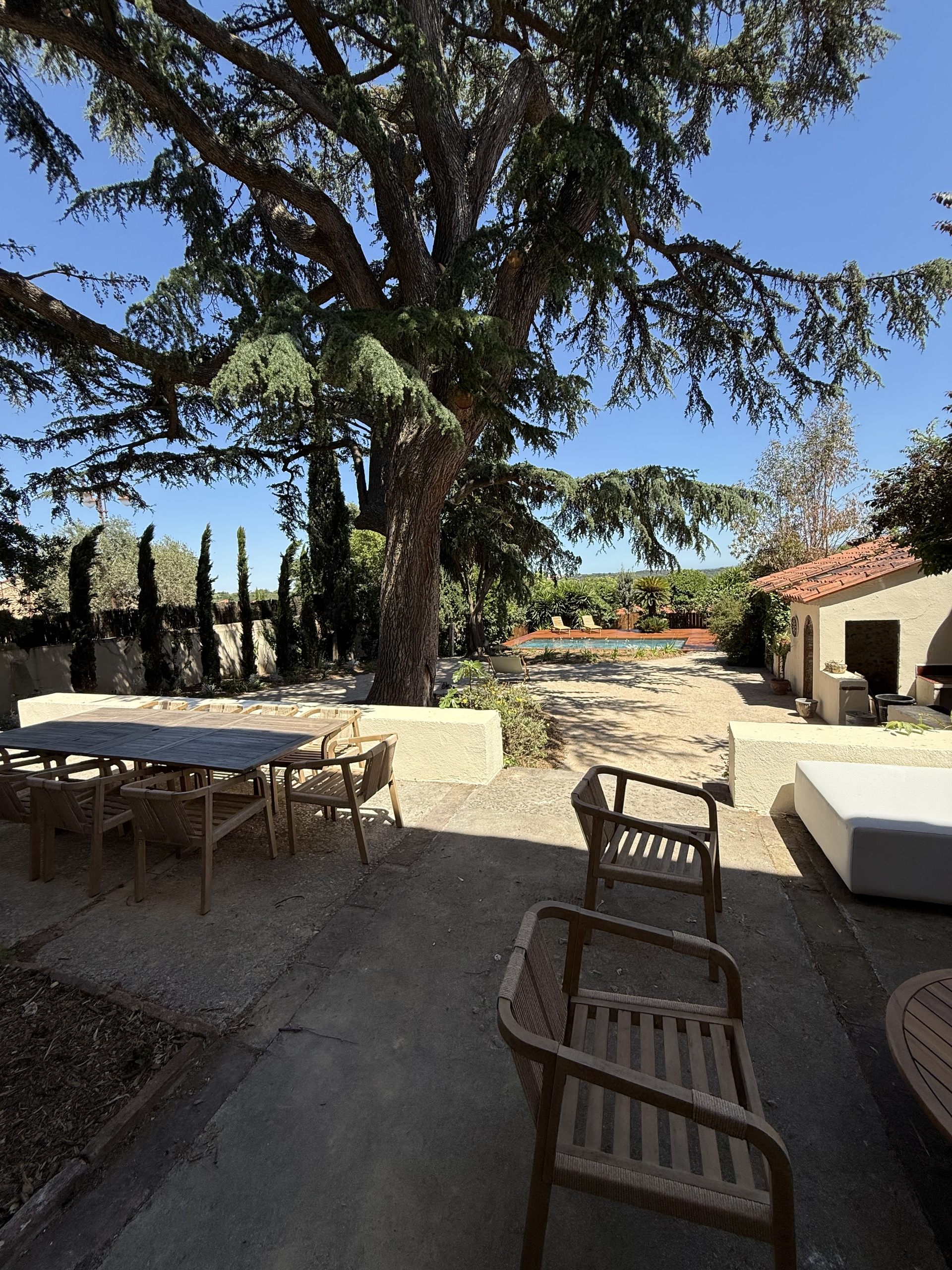 L’architecture mêle pierres, enduits minéraux, bois texturé et tonalités terre brûlée : un hommage au Roussillon. Au centre du jardin, un cèdre centenaire donne à la maison son nom et sa verticalité. Chaque espace est conçu pour un usage précis : salon ouvert, cuisine conviviale, grandes baies vitrées, terrasse orientée vers le couchant, piscine chauffée bordée de bois et jardin sans vis-à-vis.