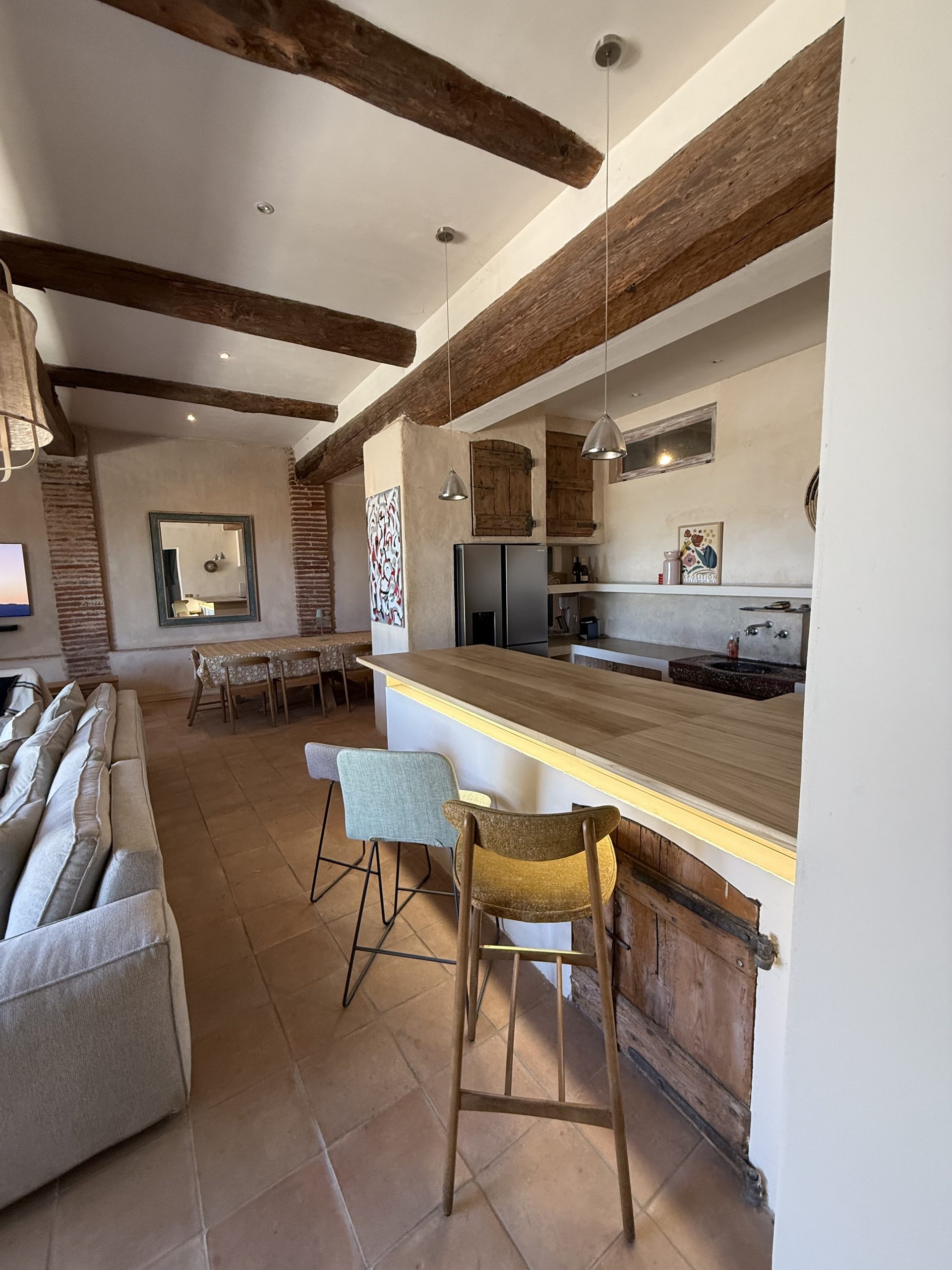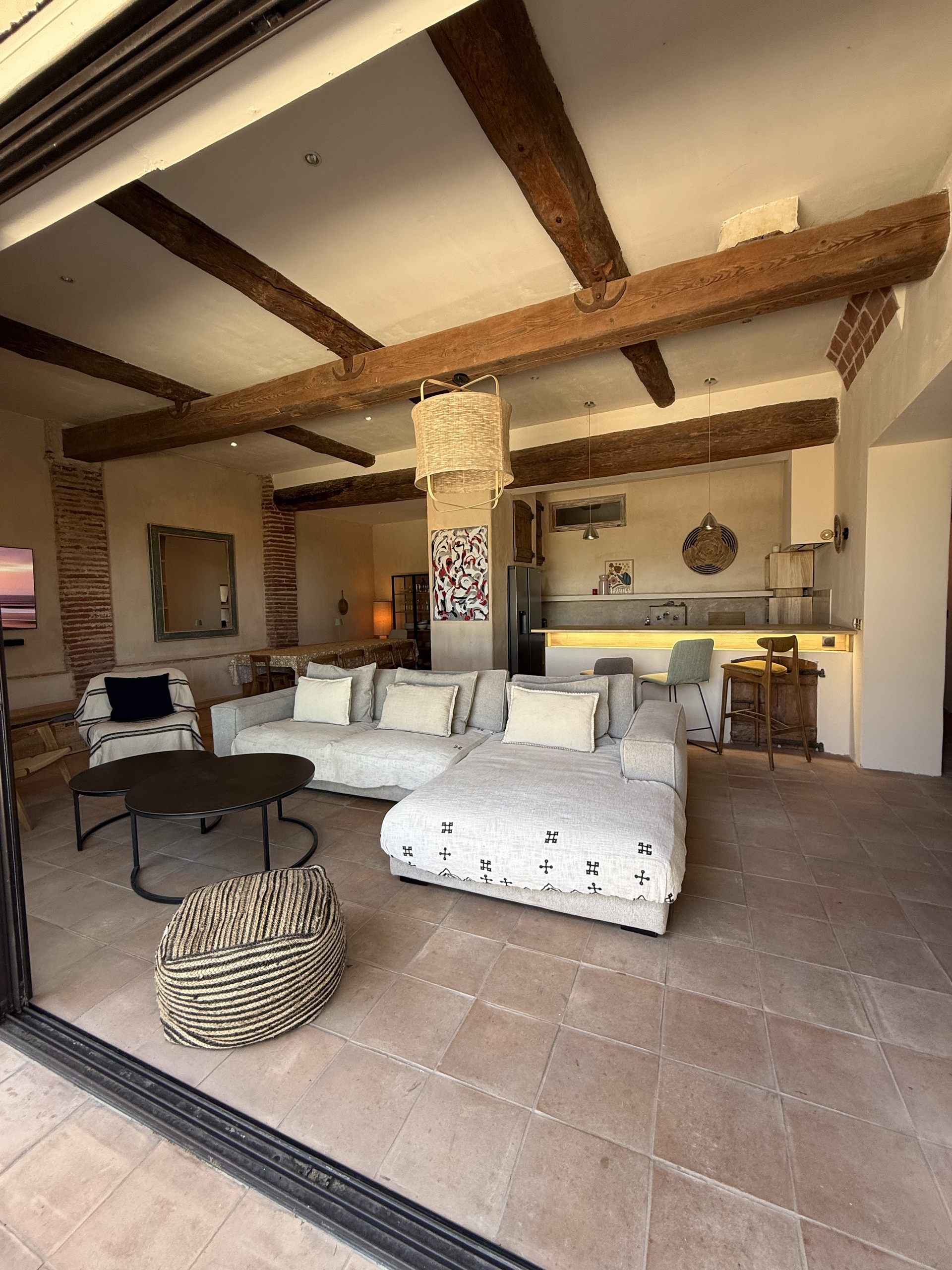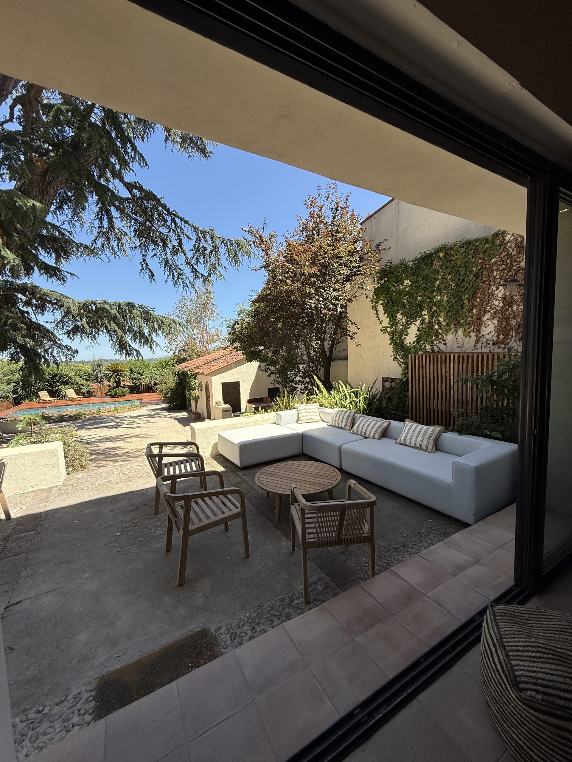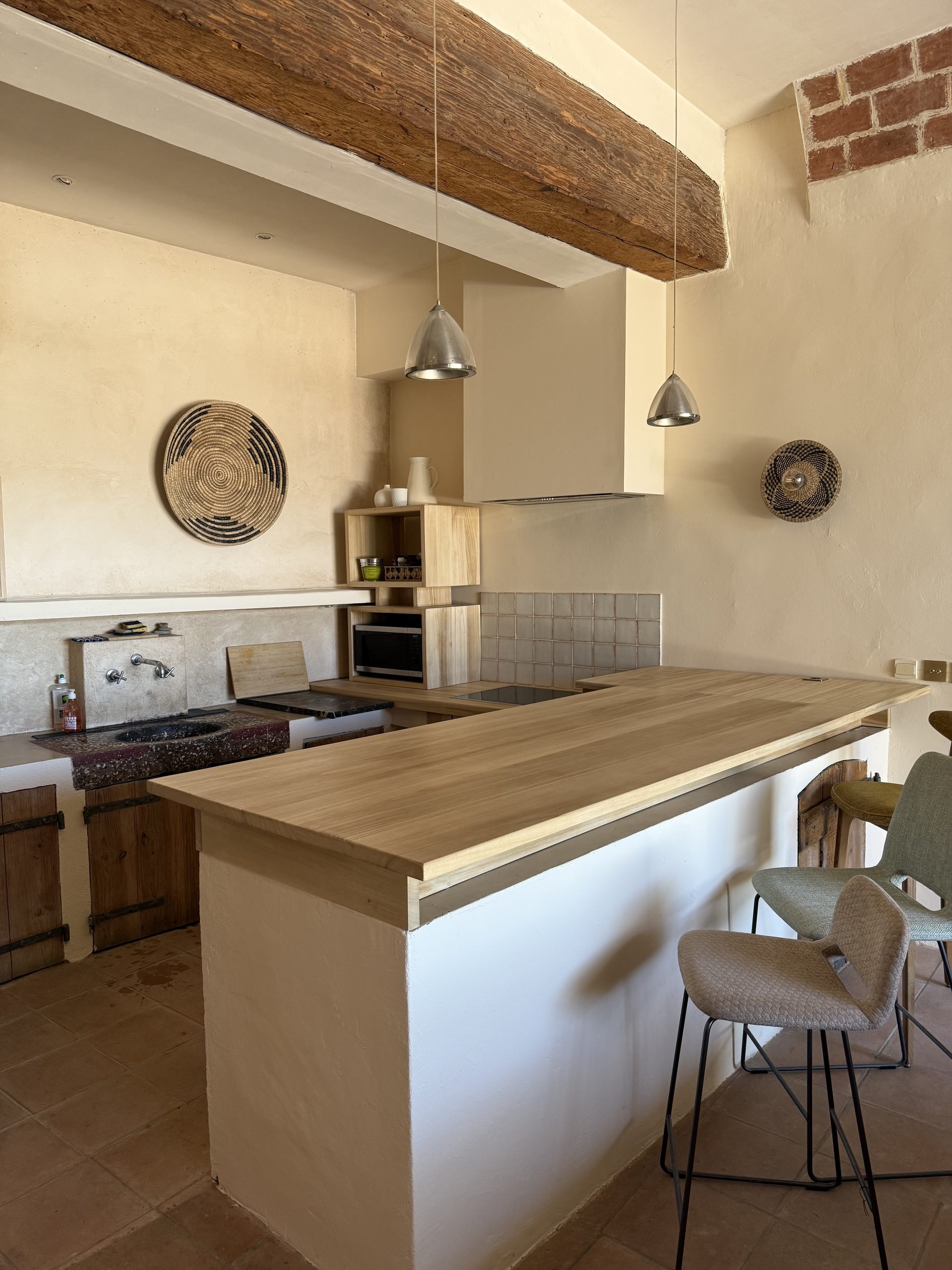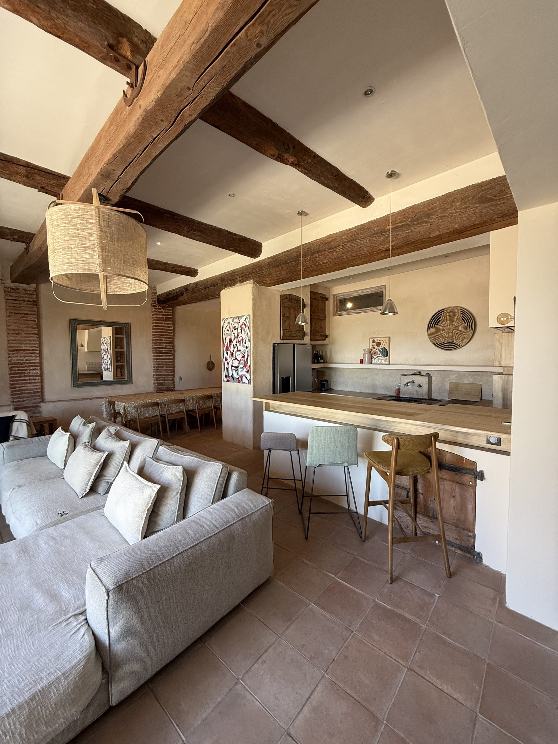 L’architecture mêle pierres, enduits minéraux, bois texturé et tonalités terre brûlée : un hommage au Roussillon. Au centre du jardin, un cèdre centenaire donne à la maison son nom et sa verticalité. Chaque espace est conçu pour un usage précis : salon ouvert, cuisine conviviale, grandes baies vitrées, terrasse orientée vers le couchant, piscine chauffée bordée de bois et jardin sans vis-à-vis.