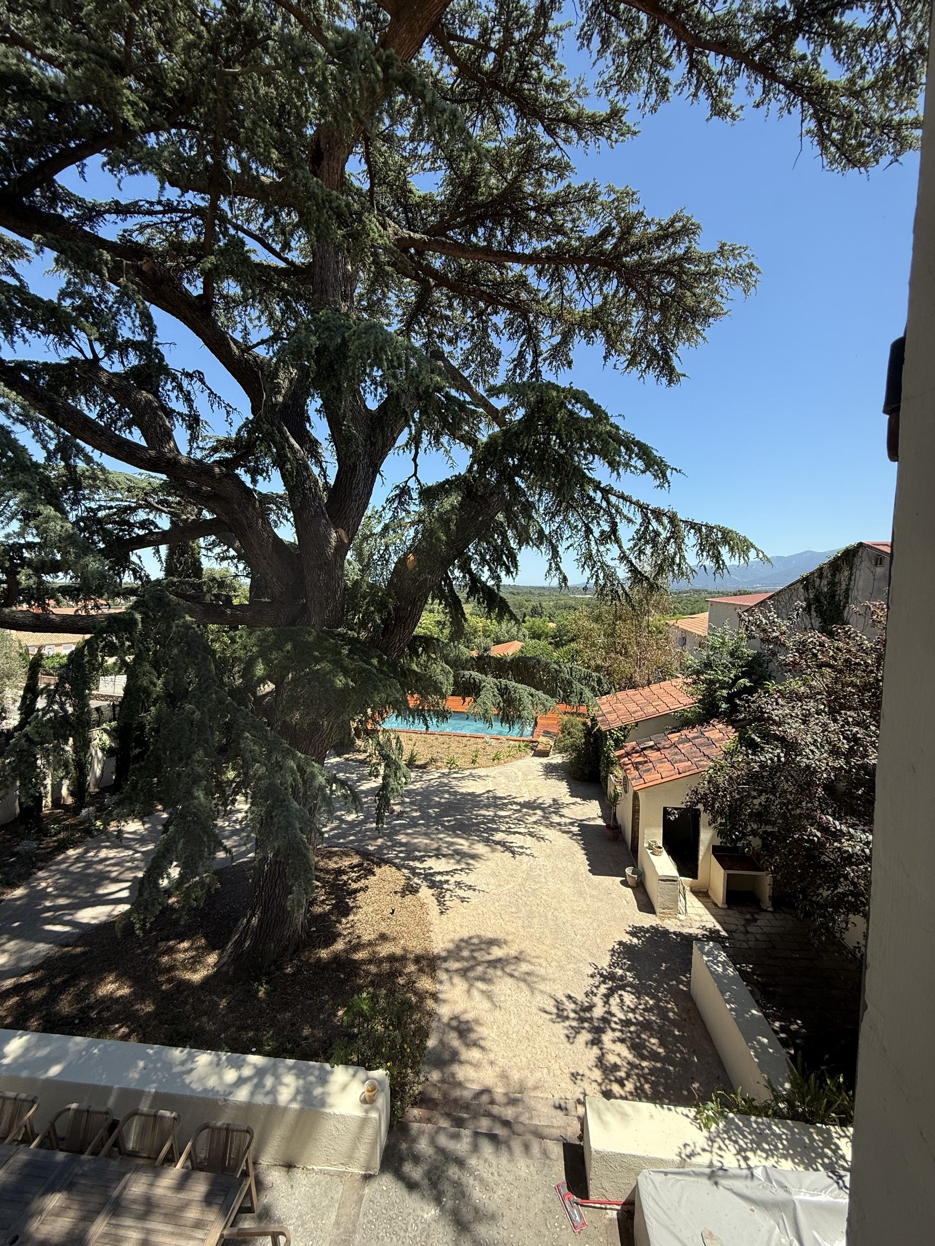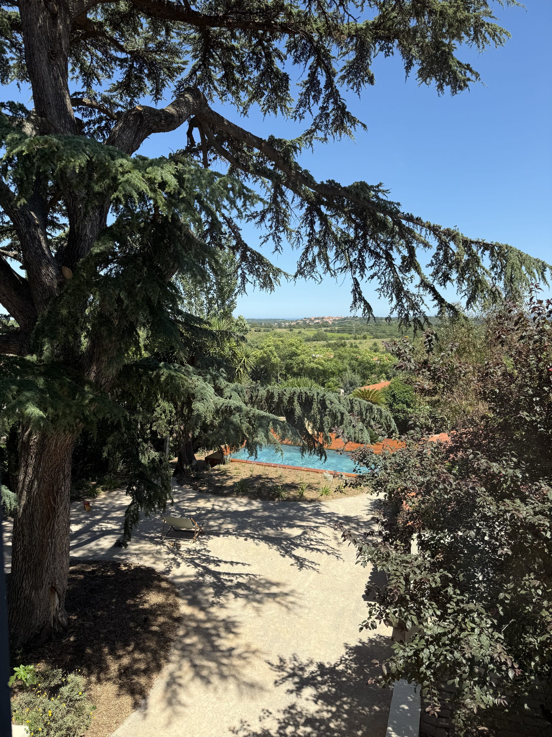 Édifiée sur les hauteurs de Tresserre, à deux pas du village de Vives, La Bastide du Cèdre domine un paysage vivant : une mosaïque de vignobles, de collines ocres, de toits de tuiles et, au loin, la ligne bleutée des Pyrénées. Les jours de belle visibilité, le regard porte jusqu’à la mer.