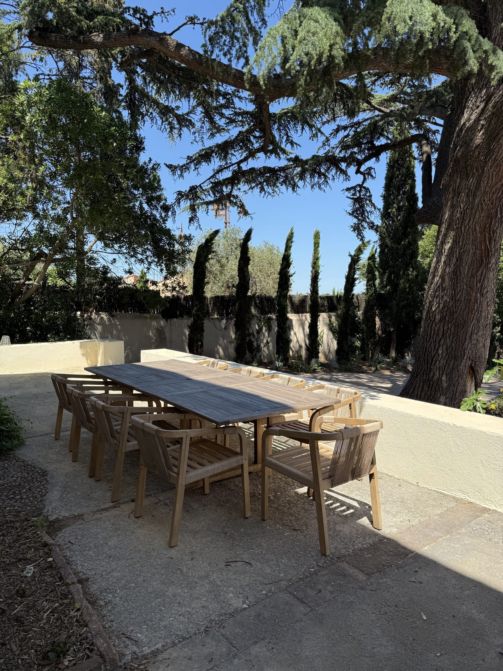 | Jardin & extérieurs | Jardin d’environ 800 m², sans vis-à-vis, vue panoramique sur le village et l’église, cèdre centenaire, salon extérieur avec canapé et table centrale, 6 transats, grande terrasse avec salle à manger extérieure pour 12 personnes, barbecue Weber gaz (2 bouteilles sur place), ping pong. |